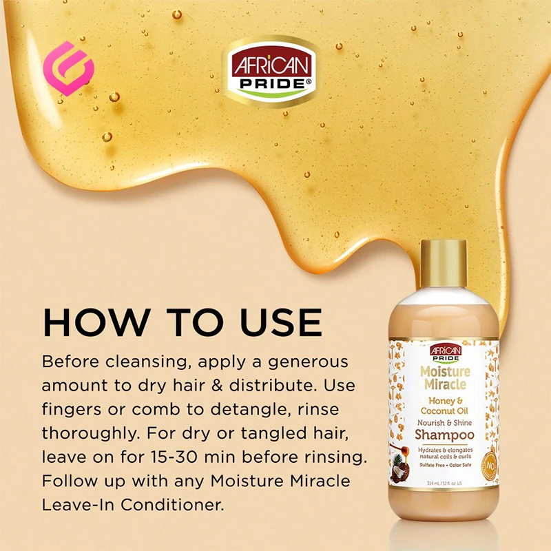 شامپو آفریکن پراید African Pride Moisture Miracle Honey & Coconut Oil Shampoo یک شامپوی مرطوبکننده و مغذی مخصوص موهای فر، خشک، ضخیم یا آسیبدیده است که با ترکیبات طبیعی مانند عسل خالص و روغن نارگیل ساخته شده است. این فرمول ملایم به طور مؤثر آلودگیها، تجمع مواد و چربی اضافی را بدون از بین بردن رطوبت طبیعی مو پاک میکند. عسل به عنوان یک مرطوبکننده طبیعی عمل کرده و رطوبت را در تارهای مو قفل میکند، در حالی که روغن نارگیل باعث نرمی و تغذیهی عمیق موها میشود.