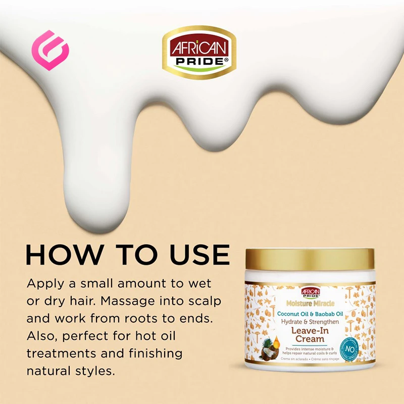کرم موی بدون آبکشی African Pride Moisture Miracle با روغن نارگیل و بائوباب، رطوبت عمیق و احیا برای موهای فر و خشک فراهم میکند—بدون سولفات یا پارابن، ایدهآل برای تقویت بافت طبیعی مو.