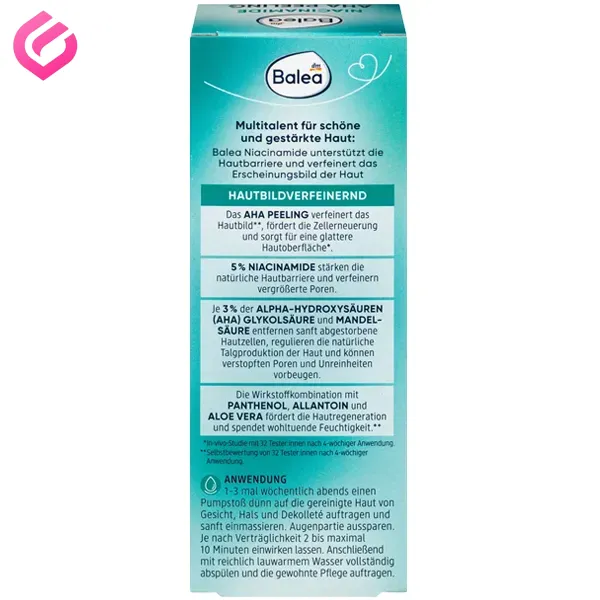 - حاوی نیاسینامید (ویتامین B3): به کاهش قرمزی و التهاب کمک کرده و ظاهر منافذ باز پوست را بهبود میبخشد.
