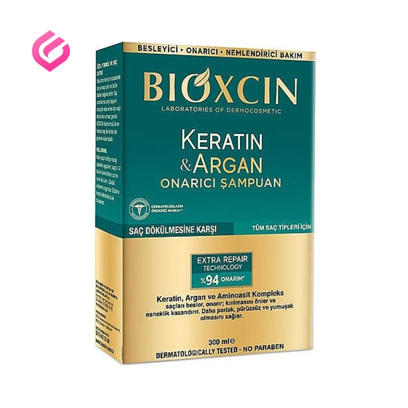 شامپو Bioxcin Keratin & Argan با فناوری Extra Repair، ترکیبی غنی از کراتین و روغن آرگان برای ترمیم 94٪ موهای آسیبدیده، جلوگیری از ریزش و افزایش درخشندگی و نرمی مو؛ فاقد پارابن و مناسب مصرف روزانه.