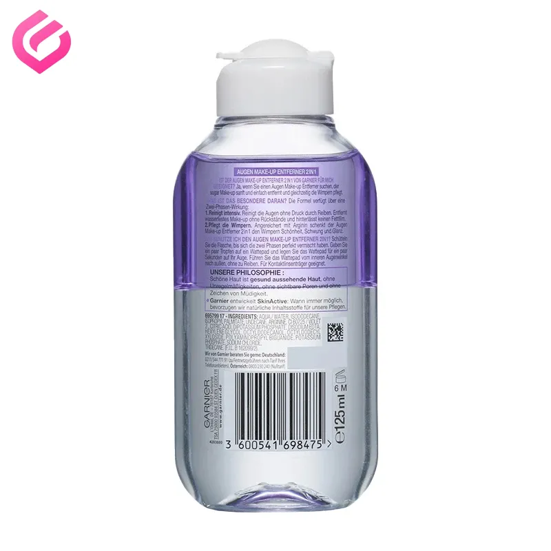 پاککننده آرایش چشم دوکاره گارنیه، ایدهآل برای پاکسازی سریع و ملایم آرایشهای ضدآب و تقویتکننده مژهها، مناسب برای پوستهای حساس.