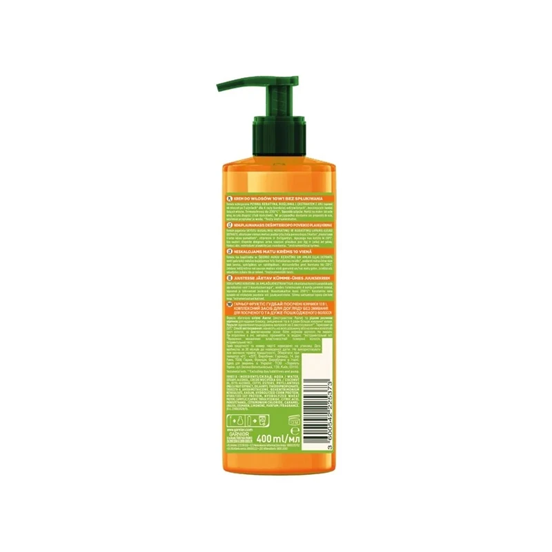 کرم موی بدون نیاز به شستشو Garnier Fructis Goodbye Damage 10in1 با عصاره آملا و پروتئینهای مرکبات، ترمیمکننده موهای آسیبدیده، محافظ در برابر گرما، و مغذی برای موهای نرم و درخشان است.
