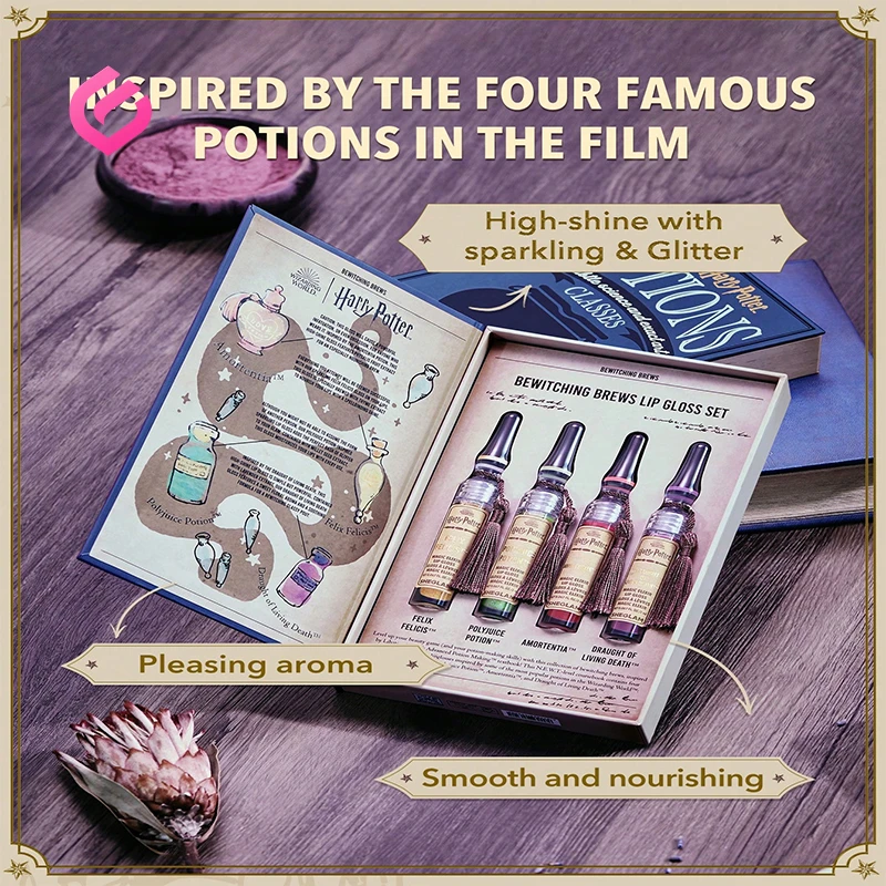 چهار شیشهی شبیه به “اکسیرهای جادویی” که 4 رنگ لیپ گلاس جذاب درونشه – طراحی آنها مستقیماً از بطریهای معجون در دنیای جادو الهام گرفته شده.