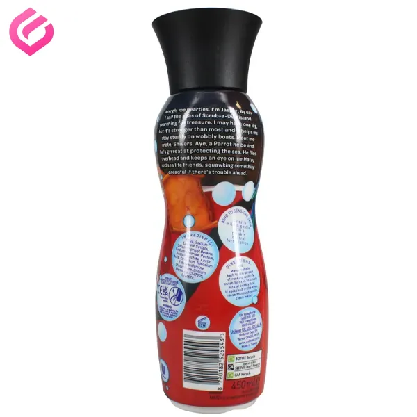 - طرح دزد دریایی شاد و بامزه: Matey Peg Leg Bubble Bath به شکل یک بطری با طرح یک دزد دریایی تک پا (Peg Leg Pirate) است. این طراحی به گونهای است که کودکان را به حمام کردن ترغیب می کند.