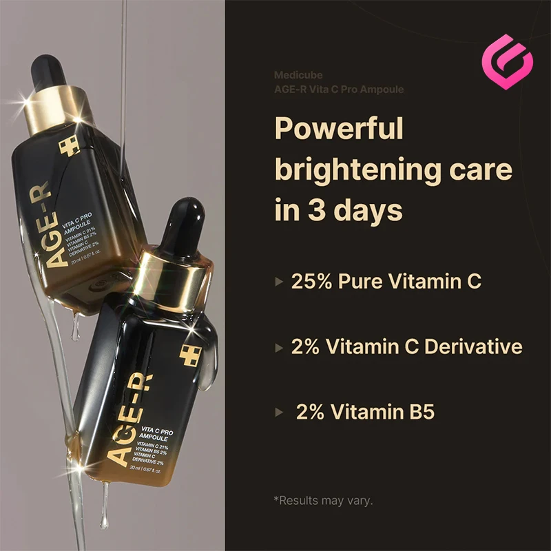 MEDICUBE AGE-R Vita C Pro Ampoule یک سرم آمپولی فوقالعاده قوی با ویتامین C خالص و پایدار است که برای روشنکنندگی، کاهش لکهای تیره، بهبود خاصیت ارتجاعی و افزایش درخشندگی پوست طراحی شده است. سرم ویتامین سی مدیکوب دارای فرمولاسیونی غنی از آنتیاکسیدانها و ترکیبات ضدپیری است که به مبارزه با رادیکالهای آزاد، چین و چروک و تیرگی پوست کمک میکند.