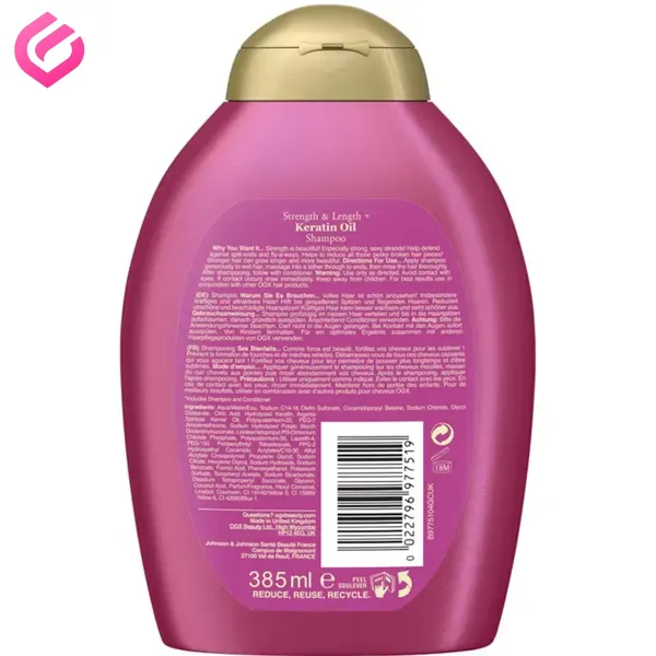 شامپو روغن کراتین او جی ایکس Strength Length، مناسب برای تقویت و ترمیم موهای آسیبدیده و شکننده، باعث افزایش طول و ضخامت موها میشود.
