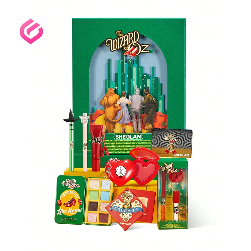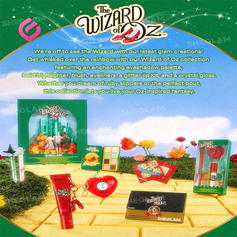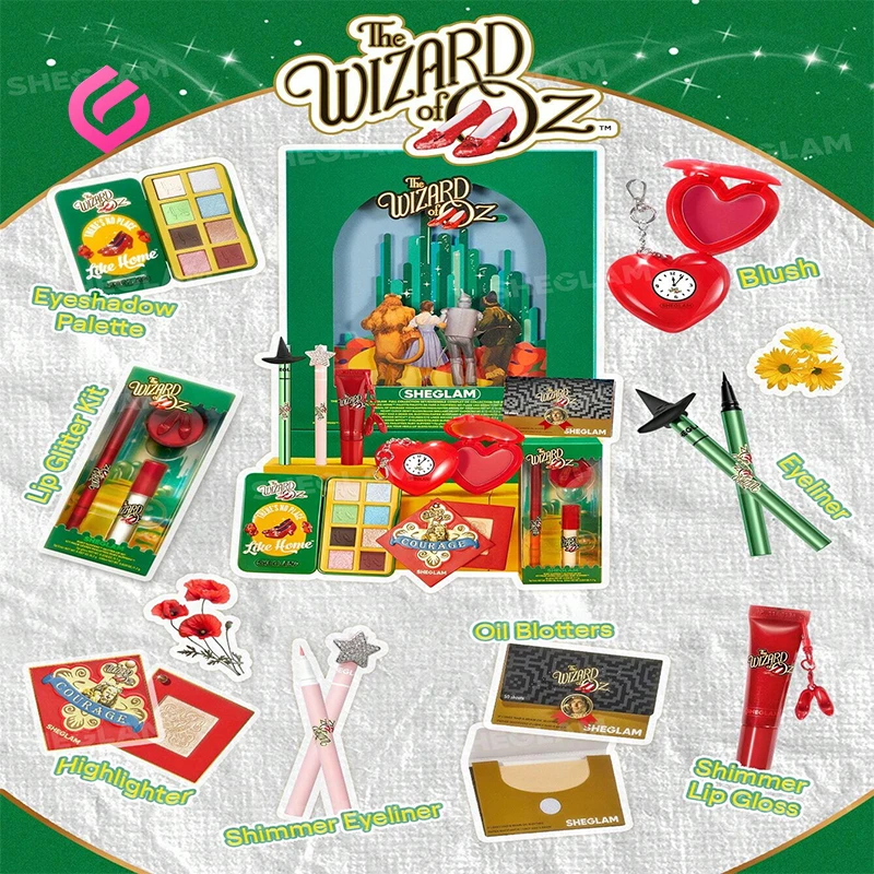 کالکشن جادوگر شهر اُز SHEGLAM The Wizard of Oz با طراحی فانتزی و الهام از فیلم کلاسیک، شامل پالت سایه چشم، رژگونه قلبی، خط چشم، برق لب، هایلایتر، شاین لاینر و کاغذ جذب چربی است—ترکیبی جادویی برای طرفداران زیبایی و نوستالژی.